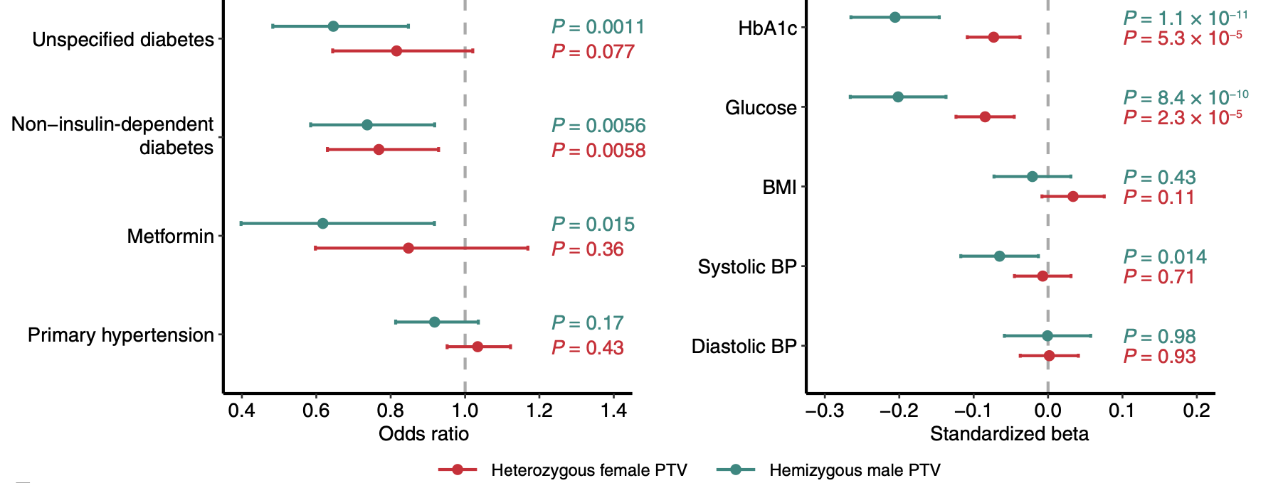 The most interesting aspect of the discovery is that MAP3K15 is an X-linked gene and the AstraZeneca scientists found that the association is strongest in the recessive model. Heterozygous females for MAP3K15 pLOFs showed an 18% reduction in T2D risk whereas hemizygous males (who are obligatory knockouts) showed a 35% reduction in T2D risk (homozygous females are rare to make meaningful estimates). The protective association was also observed for blood glucose and HbA1c levels.